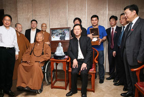 2014年11月10日上午許,在旅美畫家李自健先生的長沙創(chuàng)作室,大球泥瓷藝董事長滕召華親自請了一尊潔白如玉的《多寶佛》(釋迦牟尼佛瓷塑像)給李自健先生,并向大家介紹說,“今年初,我最開始有用珍稀原料大球泥塑造佛像題材的想法時,得到了李老師的支持。在創(chuàng)作‘釋迦牟尼佛瓷塑像’的過程中,李老師更是給了很多寶貴的意見,他希望我們能塑造出有世界聲望的佛雕作品。在李老師的引薦下,今年5月30日,我又有幸與臺灣佛光山開山宗長星云大師結(jié)緣,并將001號‘釋迦牟尼佛瓷塑像’捐贈給星云大師永久收藏于佛光山。”