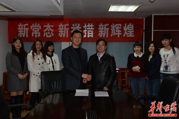 圖為湖南日?qǐng)?bào)報(bào)業(yè)集團(tuán)副總經(jīng)理徐勇和湖南大球泥瓷藝有限公司董事長(zhǎng)滕召華在合作協(xié)議上簽字。