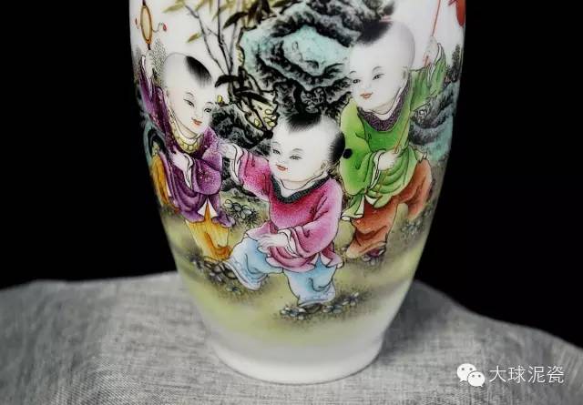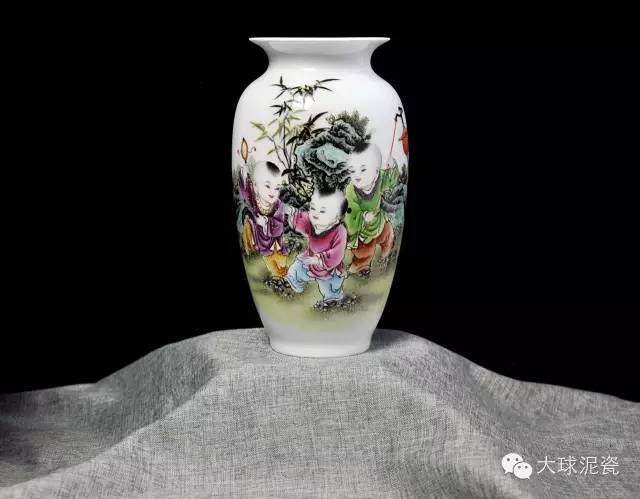 《歡天喜地》藕瓶,以大球泥為主要原材料,景德鎮(zhèn)省級工藝美術(shù)大師創(chuàng)作,與釉上粉彩工藝相結(jié)合,使得瓷器上的圖案,豐富多彩,色澤鮮艷,立體感強。