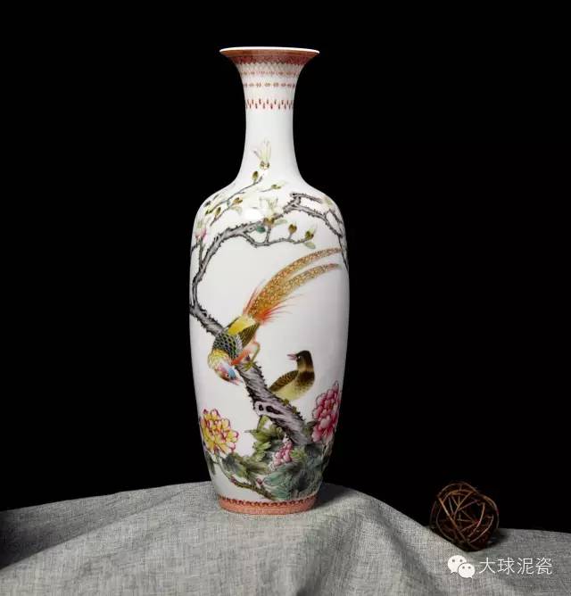 《錦堂高貴》柳葉瓶,由省級工藝美術(shù)大師徐國明創(chuàng)作,以大球泥為原材料。胎骨細白堅致,釉質(zhì)光潔瑩潤,繪工細膩。