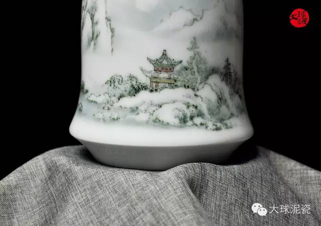 水墨國(guó)畫與大球泥瓷的完美融合,工筆重彩隨著畫面的延伸而流動(dòng)、轉(zhuǎn)變,使得畫面有著虛無(wú)縹緲的美麗,有著詩(shī)情畫意的朦朧,讓觀賞者的心靈從塵世間得以解脫,得以愉悅。細(xì)細(xì)欣賞著《風(fēng)花雪月》收口瓶,仿佛我們置身于高山原野,飄蕩在岸邊的烏船上,休憩山間樹(shù)林中的涼亭里,在霧氣繚繞的山水間,隨波逐流。而頭頂上的太陽(yáng)隨時(shí)會(huì)沖破云層與迷霧,光芒萬(wàn)丈,使人心生希望與向往。“此景只應(yīng)天上有”,這正是《風(fēng)花雪月》收口瓶的魅力之處,讓人舍棄塵埃,心想著一場(chǎng)與“風(fēng)花雪月”有關(guān)的故事。