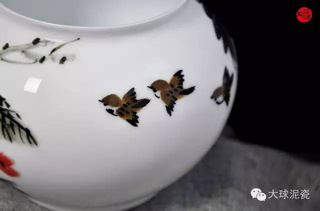 綠蔓如藤不用栽,淡青花繞竹籬開。 披衣向曉還堪愛,忽見晴蜓帶露來。 ——陳宗遠(yuǎn)·《牽;ā 作品介紹 《壯志凌云》小瓷罐,描繪著一副在深秋的傍晚,紅艷艷的牽;ㄨ簿`放的情景。瓷罐上紅艷的牽;ê秃幕ɡ伲c(diǎn)綴在以濃墨勾畫的枝葉藤蔓上,不僅映襯出牽牛花的嬌美,也令畫面更具層次感。一群從遠(yuǎn)處飛來的雀鳥,使得畫面活潑生動(dòng),令人感受到在這深秋蕭瑟的景色中,仍感覺到生命的活力。 從造型上來看,《壯志凌云》小瓷罐,圓身鼓腹,沉穩(wěn)而古樸,使得整件作品顯得更為高挺,其屹立之姿威武而雄壯。而瓷罐上描繪著在深秋的傍晚,一叢叢紅艷艷的牽;ㄓL(fēng)霜露盛開,其本意為不肯屈服現(xiàn)實(shí)的殘酷,以一種獨(dú)立、堅(jiān)強(qiáng)、自信向人們展示的豁達(dá)之美。