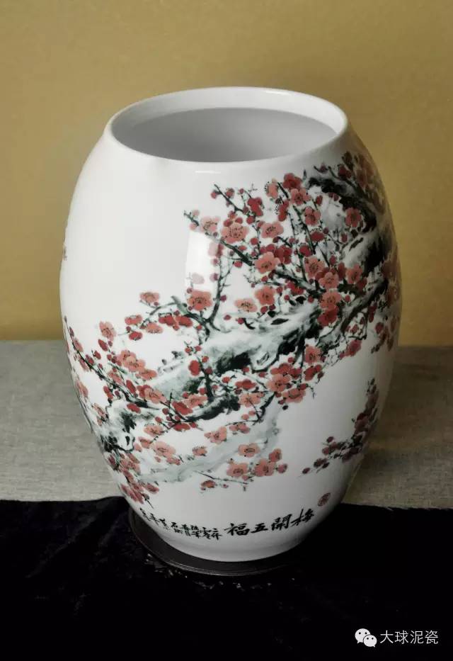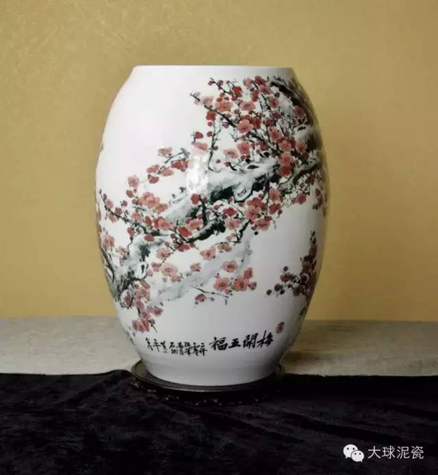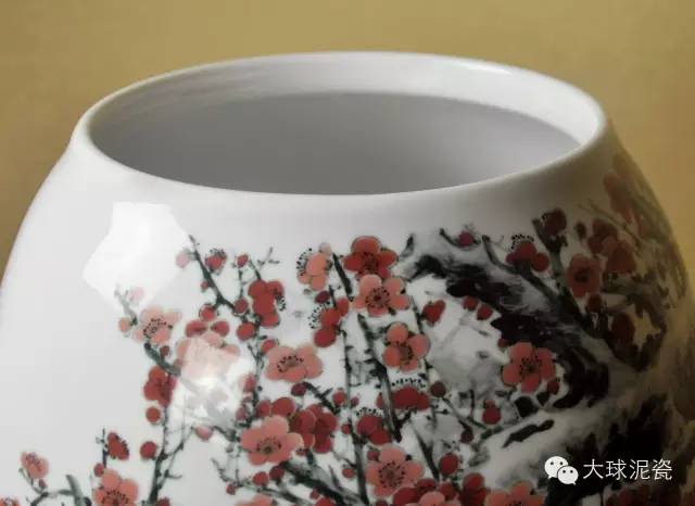 細(xì)觀此作品,運(yùn)用了釉下五彩的工藝手法,圓身鼓腹,器形渾圓飽滿,線條流暢,顏色鮮艷奪目,吉祥喜慶,別有一番風(fēng)韻。畫面中的梅樹枝干盤根錯(cuò)節(jié),蒼勁有力。細(xì)枝層出,短密交錯(cuò)。梅花傍枝而生,層層簇簇,競相開放,好一副生機(jī)勃勃的景象。