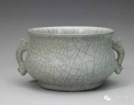 哥窯的主要特征是釉面有大大小小不規(guī)則的開裂紋片,俗稱“開片”或“文武片”,這是發(fā)生在釉面上的一種自然開裂現(xiàn)象,原本是瓷器燒制中的缺陷,后來人們掌握了開裂的規(guī)律,有意識地讓它產(chǎn)生開片,從而形成了一種獨特的美感。細小如魚子的叫“魚子紋”,開片呈弧形的叫“蟹爪紋”,開片大小相同的叫“百圾碎”。