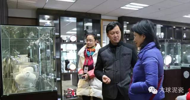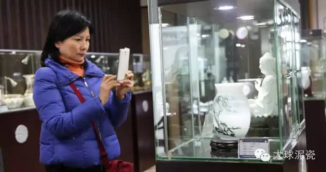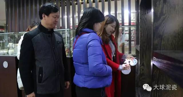 王主任首先參觀了大球泥瓷藝的精品展示廳,第一次見到大球泥瓷廬山真面目的王主任一走進(jìn)展廳,便被眾多光彩熠熠的作品吸引住了目光。她一邊仔細(xì)地觀賞每一件作品,一邊拿起手機(jī)興致勃勃地拍照,說(shuō)要把這么精美的瓷器發(fā)到朋友圈和好友們一起分享。