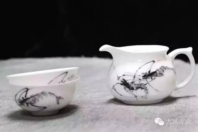 得石溪潤,有蝦水靈。世人皆知白石在宣紙上畫蝦落墨成金,靈動活潑,卻不知在瓷器上畫蝦尤為神韻充盈,尤其是在晶瑩剔透的大球泥瓷上畫蝦,更顯妙筆傳神。