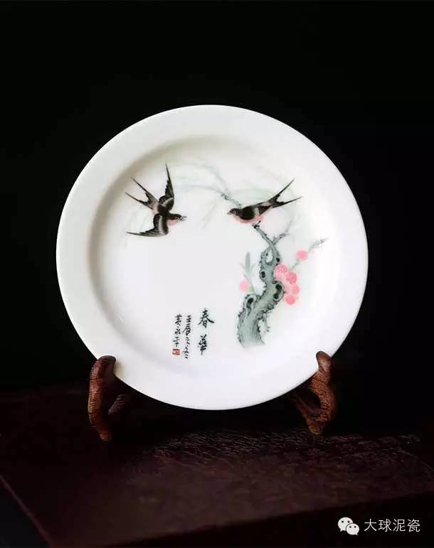 《春華》瓷盤,由工藝美術大師創(chuàng)作,采用釉下五彩工藝。賀知章有一首著名的七言絕句《詠柳》,其中寫道“碧玉妝成一樹高,萬條垂下綠絲絳!碧拼膶W