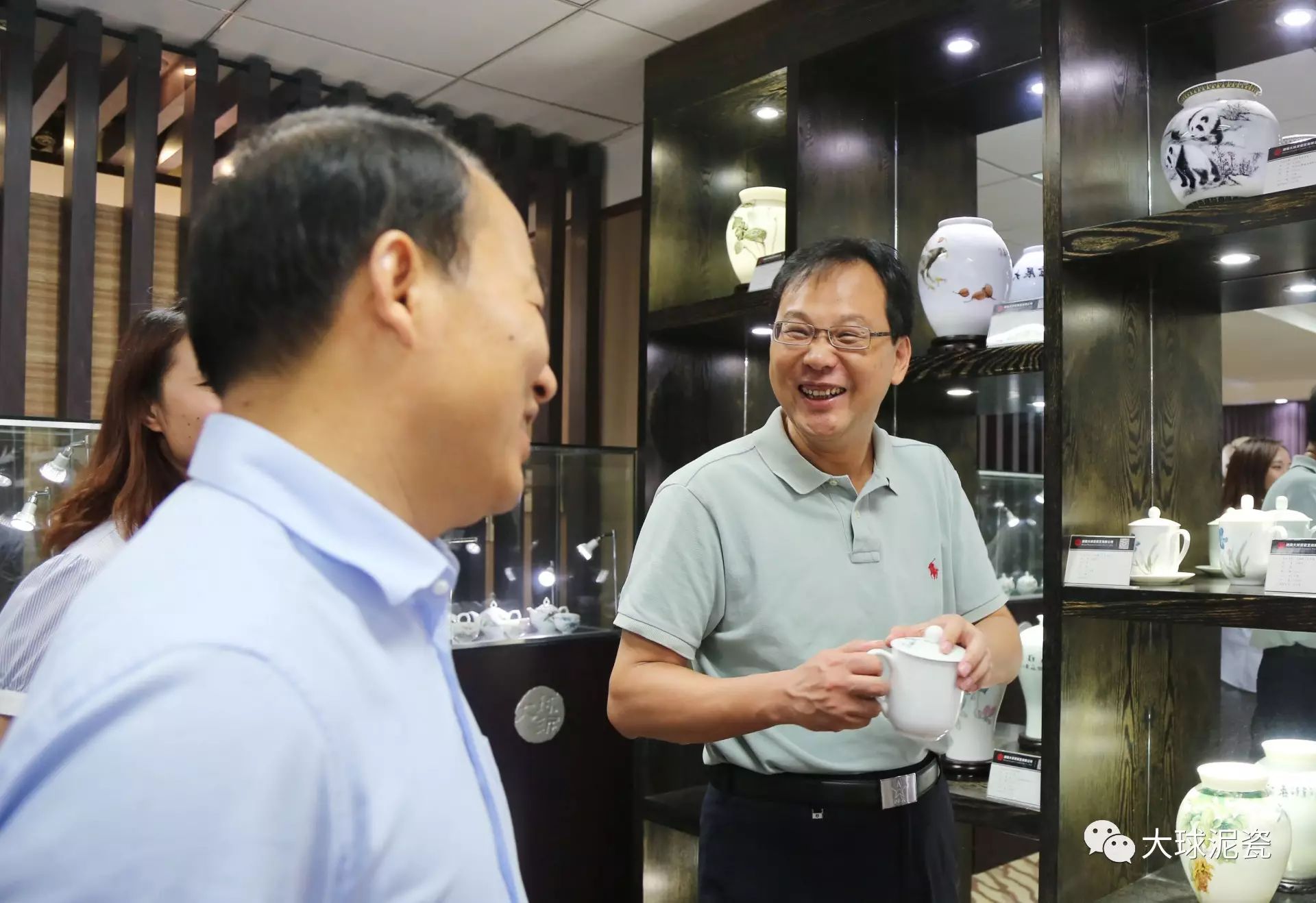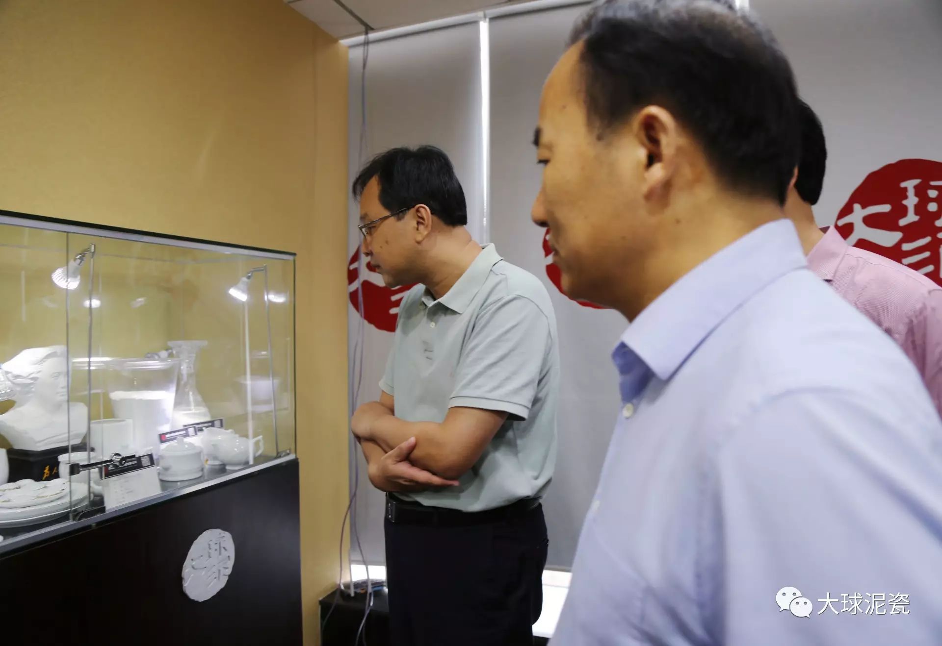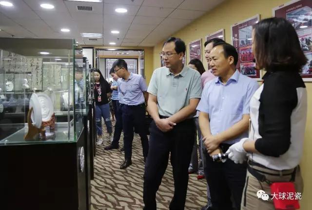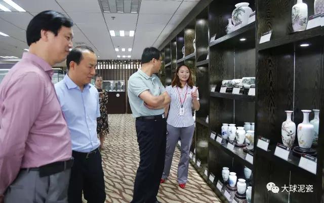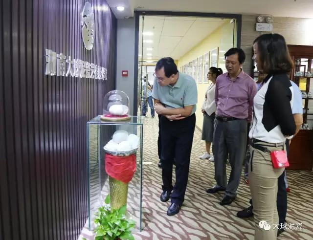 程主任、高部長(zhǎng)一行在滕董的陪同下參觀了大球泥瓷精品展廳,仔細(xì)聽取了工作人員對(duì)大球泥原料的形成、發(fā)現(xiàn)、存量以及大球泥瓷各種器型、工藝、畫面特點(diǎn)的介紹。