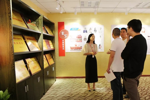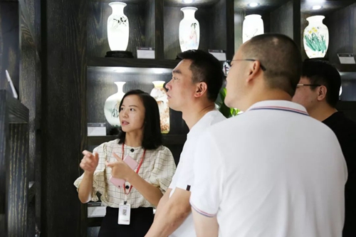 湯總一行首先參觀了公司企業(yè)文化展廳和產(chǎn)品展示廳,營銷總監(jiān)徐亞美作了全程講解。湯總一行對大球泥原料這一核心競爭力表現(xiàn)出濃厚的興趣,認為大球泥精典作品出彩,文化價值和藝術價值非凡,單論白色瓷質(zhì)的高貴瑩潤,就已是精品,其工藝水平更是高超。