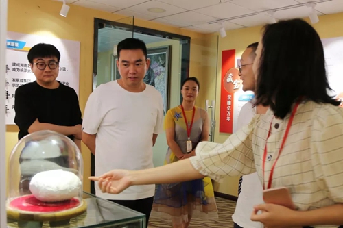 8月8日上午,湖南國際頻道常務副總監(jiān)(主持工作)湯集安、副總監(jiān)劉輝、總監(jiān)助理任帥等一行到大球泥瓷藝考察指導,董事長滕召華、常務副總張萍等陪同考察座談。
