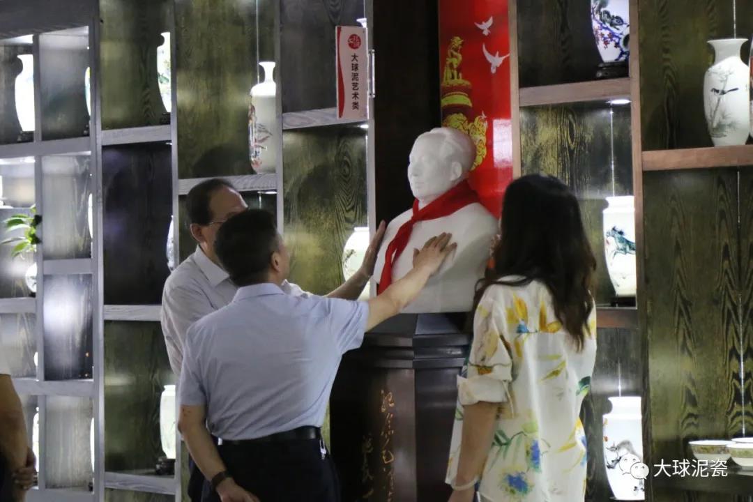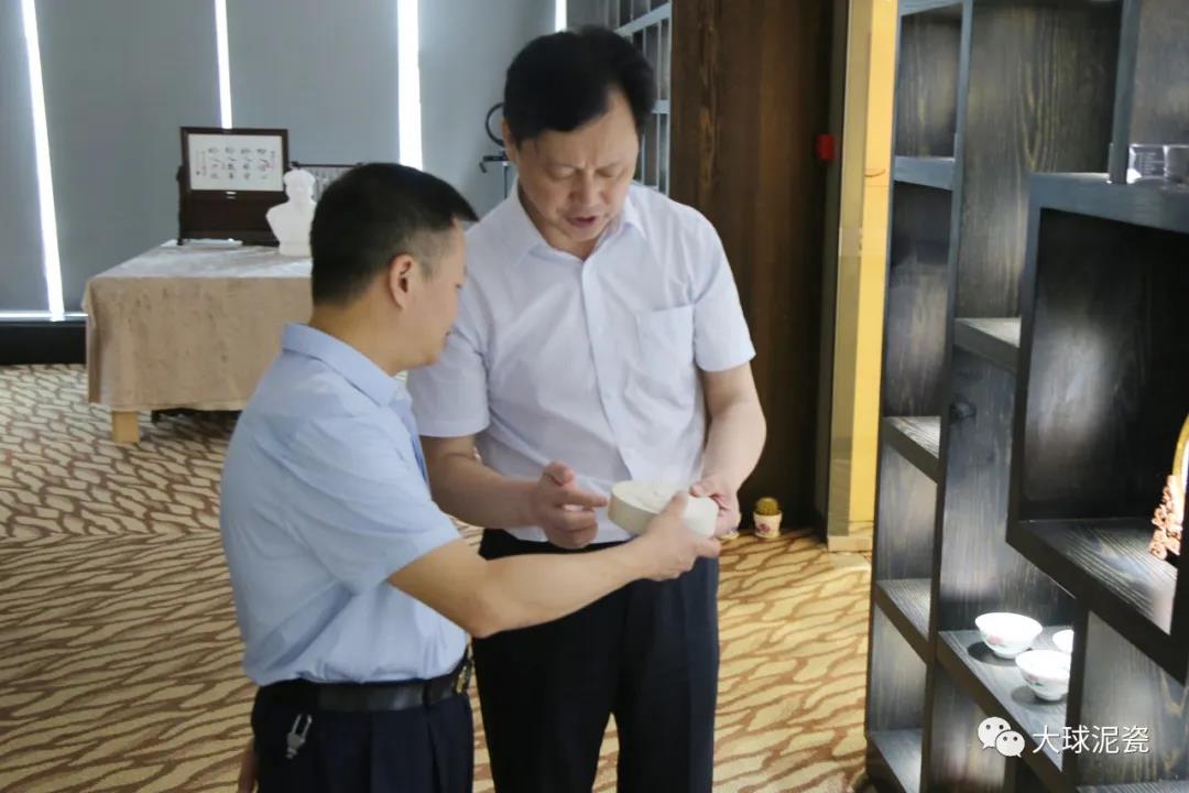 賀廳長一行首先參觀了公司的精品展廳,常務(wù)副總張萍作了專業(yè)講解。賀廳對映入眼簾的大球泥原料產(chǎn)生了興趣:“這個(gè)雪白球狀的原料是經(jīng)過加工提煉的?”滕總回答:“從地下挖出來就是這個(gè)樣子。大球泥是偉晶巖風(fēng)化物,全部為橢圓球狀,一般在20cm大小, 雜質(zhì)都集中于球體中心形成一個(gè)內(nèi)核,是世上極為稀有的非金屬礦石!痹诳吹搅宅槤M目的高端藝術(shù)陶瓷時(shí),他被深深吸引了,拿著大球泥作品和普通泥作品在燈光下進(jìn)行比較,發(fā)現(xiàn)一個(gè)白、潤、透,一個(gè)黃、渾、淡,問兩個(gè)作品的厚度是否一樣,滕董答兩個(gè)作品的厚度、畫面完全一樣,但品質(zhì)效果明顯不同。郭局長則打開手機(jī)燈光對大球泥的杯子和優(yōu)質(zhì)泥杯子反復(fù)照探,比較差異。其他領(lǐng)導(dǎo)也是提問不斷,工藝技術(shù)、產(chǎn)品質(zhì)量、創(chuàng)作風(fēng)格、市場細(xì)分等等。