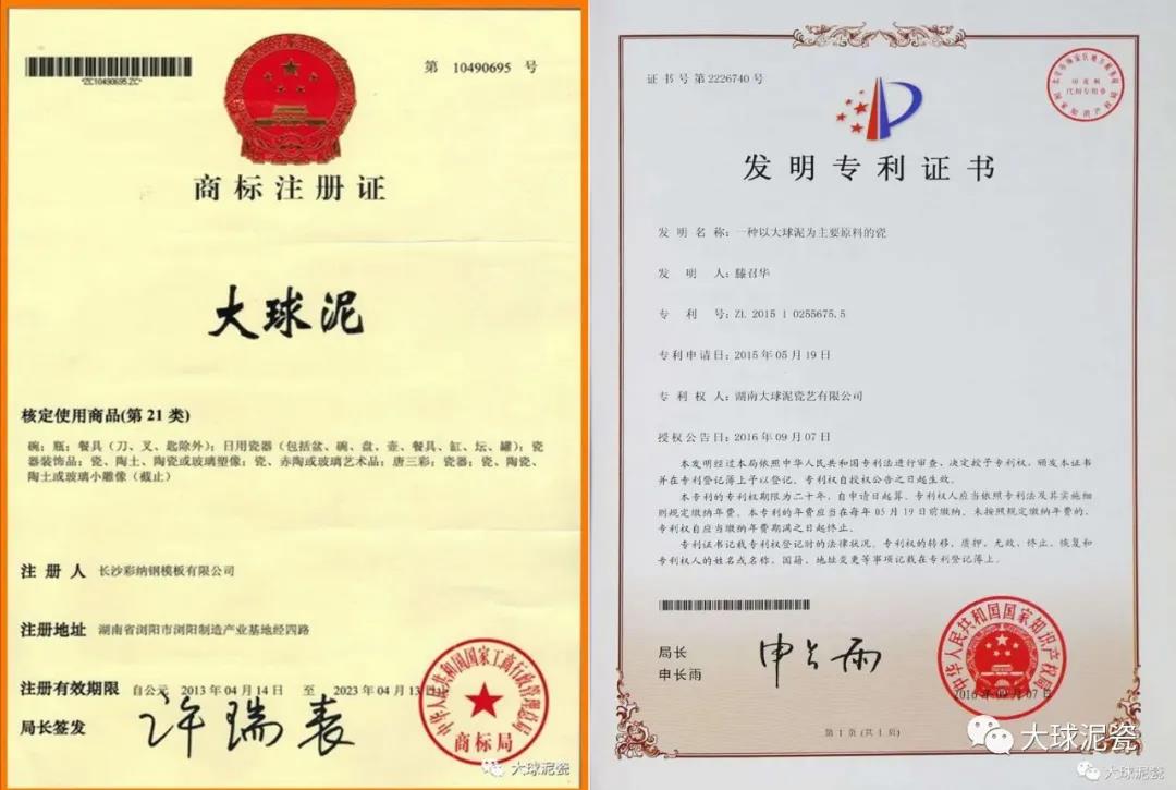 二、“大球泥”是注冊(cè)商標(biāo)。在國(guó)家工商管理總局申請(qǐng)資料上查詢到,2012年1月之前長(zhǎng)沙彩納鋼模板有限公司就申請(qǐng)注冊(cè)“大球泥”這個(gè)商標(biāo),2013年4月14日國(guó)家工商管理總局頒發(fā)注冊(cè)商標(biāo)證書。媒體報(bào)道,滕召華通過十余年的不懈努力,前后投入近億元,對(duì)大球泥原料及工藝配方進(jìn)行搶救性保護(hù);組織中國(guó)工程院院士、陶瓷專家、材料專家對(duì)大球泥進(jìn)行深度研究;組織科研人員及工匠,經(jīng)過上百次的配方試驗(yàn),終于獲得了理想的大球泥煉制配方;突破了高溫釉下五彩藝術(shù)瓷的技術(shù)難題,結(jié)合景德鎮(zhèn)青花、德化白瓷雕塑、宜興紫砂壺、臺(tái)灣琺瑯彩等工藝技術(shù),發(fā)明了大球泥的獨(dú)創(chuàng)燒制方法。湖南大球泥瓷藝有限公司 自2013年注冊(cè)了“大球泥”商標(biāo)之后,又注冊(cè)了“大球泥瓷” 、“大泥球”、 “球泥”、“球泥瓷坊”、“白鳳凰”等一系列商標(biāo)。