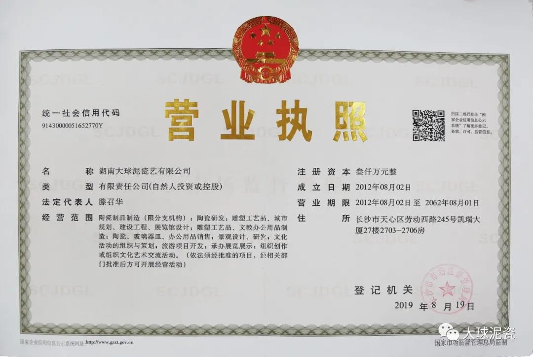 三、“大球泥”是知名企業(yè)。在湖南省工商管理局的企業(yè)注冊(cè)登記資料中查詢“大球泥”得知,湖南大球泥瓷藝有限公司于2012年8月2日在湖南省工商管理局注冊(cè)成立并領(lǐng)取營(yíng)業(yè)執(zhí)照,之后又有幾次營(yíng)業(yè)范圍變更,但是名稱一直沿用至今。在百度上查詢“大球泥”是國(guó)家特色文化產(chǎn)業(yè)重點(diǎn)項(xiàng)目、國(guó)家高新技術(shù)企業(yè)、湖南省特色文化產(chǎn)業(yè)示范基地、湖南省雙創(chuàng)示范基地等。該公司是我國(guó)高端藝術(shù)陶瓷《大球泥瓷》地方標(biāo)準(zhǔn)的制定者,擁有專利近百項(xiàng),“大球泥”也是湖南著名品牌。營(yíng)業(yè)范圍為大球泥原料研究,高端藝術(shù)陶瓷定制,文旅項(xiàng)目開發(fā),城市品牌策劃,公共文化藝術(shù)工程等領(lǐng)域。