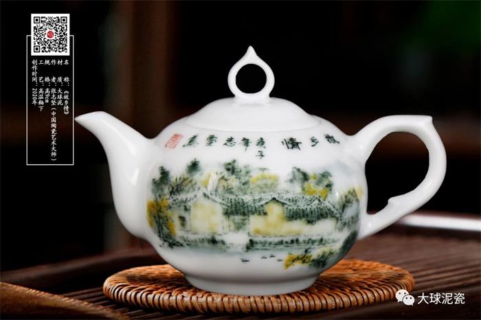 《故鄉(xiāng)情》是由國家正高級工藝美術(shù)師滕召華設(shè)計創(chuàng)意、中國陶瓷工藝大師張志堅手繪。作品用劉少奇同志故居為寫實(shí)背景,以秋天樹葉金黃為意境,寓意落葉歸根、思念故鄉(xiāng)。作品以珍稀大球泥為原料,運(yùn)用國家非物質(zhì)文化遺產(chǎn),采用釉下手繪方式,經(jīng)1400度高溫,三次燒制而成,瓷質(zhì)集溫潤、通透、潔白于一體,具有藝術(shù)、非遺、材料等多重價值。