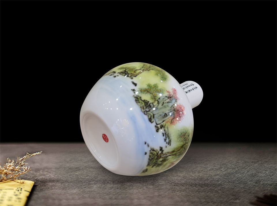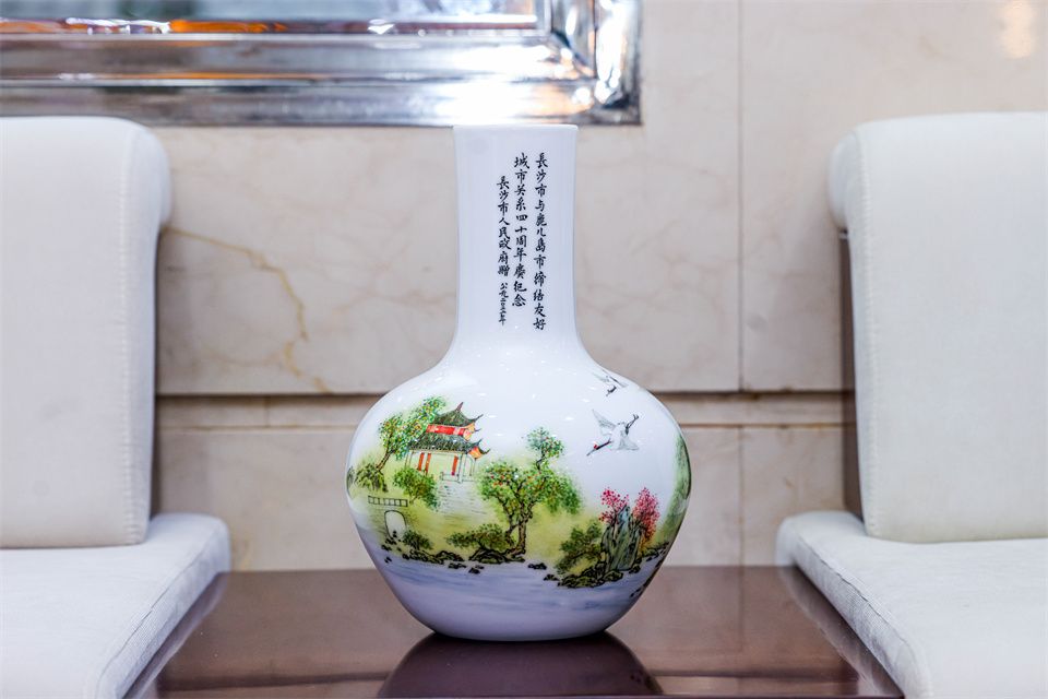 《友誼》瓶,選用中國(guó)陶瓷最經(jīng)典器型,瓶型為直口、長(zhǎng)頸、豐肩、圓腹、淺圈足,造型古典端莊,線條優(yōu)美圓潤(rùn)。以稀缺大球泥為原料,用釉下高溫工藝三次燒制而成。畫面以兩個(gè)城市最具代表性的風(fēng)景為題材,長(zhǎng)沙的岳麓山愛(ài)晚亭與鹿兒島的櫻島火山景交相輝映、融為一體,寓意兩個(gè)城市山水相依、睦鄰友好、共同發(fā)展。