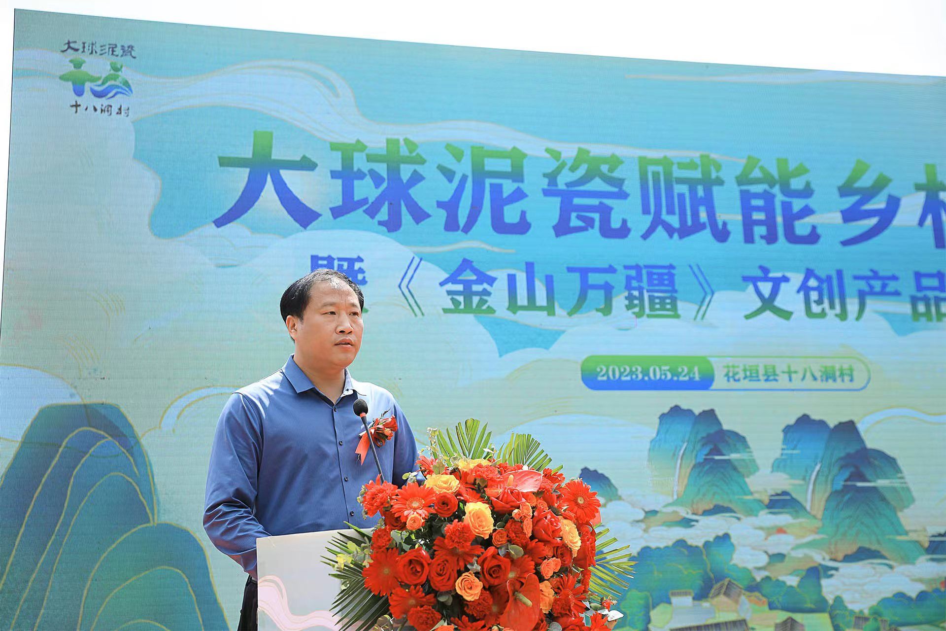 2023 年 5 月 24 日上午,大球泥瓷賦能鄉(xiāng)村振興暨《金山萬疆》文創(chuàng)新品發(fā)布會(huì)在花垣縣十八洞村村部舉行。省文旅廳三級(jí)調(diào)研員劉彬、長(zhǎng)沙市委宣傳部四級(jí)調(diào)研員何小紅、湘西州文旅廣局副局長(zhǎng)呂冠軍、花垣縣委常委、宣傳部長(zhǎng)滕召帆、十八洞村委會(huì)副主任、經(jīng)濟(jì)聯(lián)合社理事長(zhǎng)龍書優(yōu)等出席。